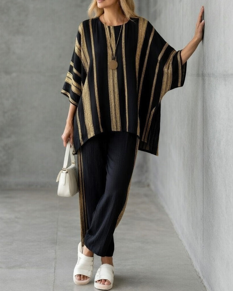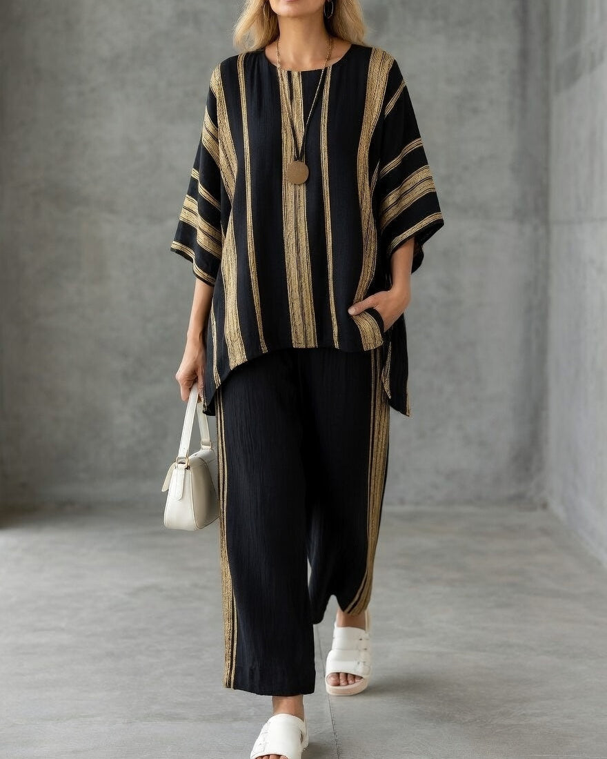 Maritieme strepen en ontspannen luxe komen samen in deze luchtige tweedelige set, perfect voor stijlvolle, zonovergoten dagen.